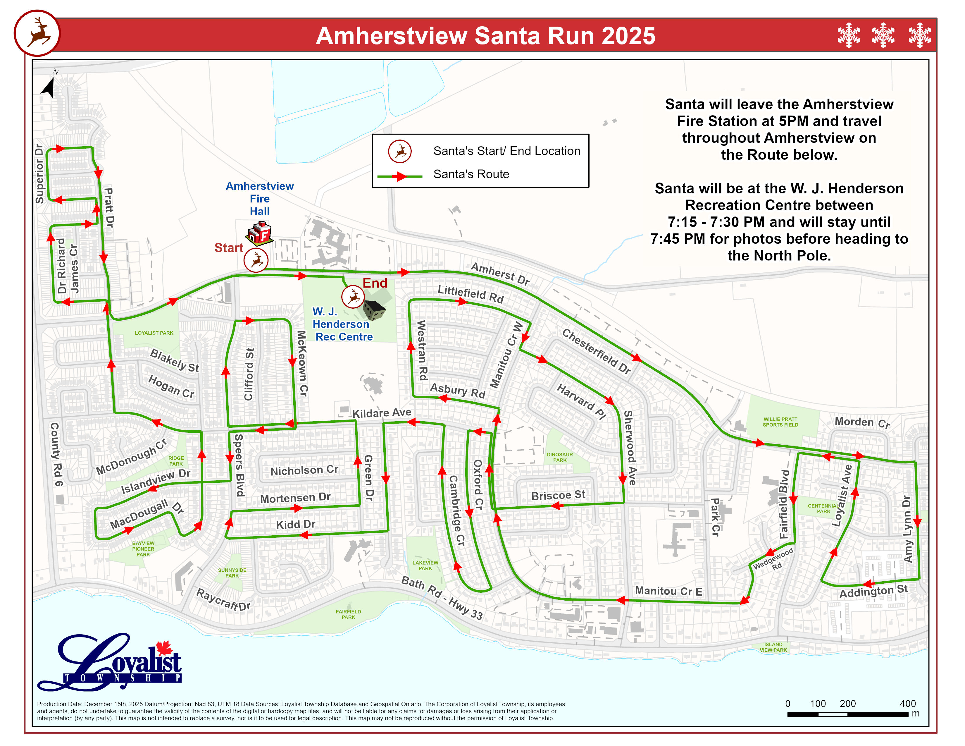 Santa will be making a special stop! Catch him at the W.J. Henderson Recreation Centre, Amherstview, ON parking lot between 7:15 p.m. and 7:30 p.m. (timing may vary depending on the parade length). Stop by to snap a festive photo with Santa and wish him a speedy Christmas delivery!